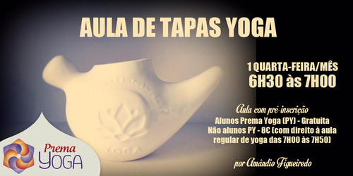 O Prema Yoga informa que a aula de Tapas Yoga passa a vigorar uma Quarta-feira por mês, das 6h30 às 7h00, meia-hora antes da aula regular de yoga que se mantém no seu horário de sempre, ou seja, entre as 7h00 e as 7h50.